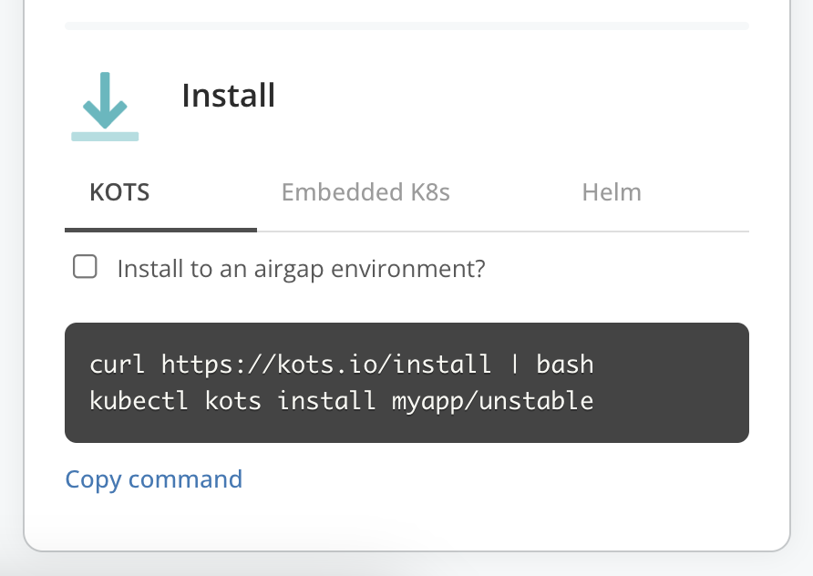 For information about getting installation commands with the Replicated CLI, see channel inspect. For information about getting installation commands with the Vendor API v3, see Get install commands for a specific channel release in the Vendor API v3 documentation.